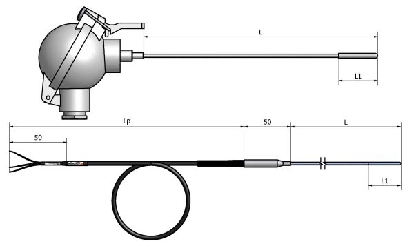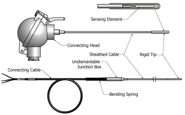 一般较小的传感元件 -直径为2至5mm-连接到能够弯曲的不锈钢矿物绝缘电缆上。