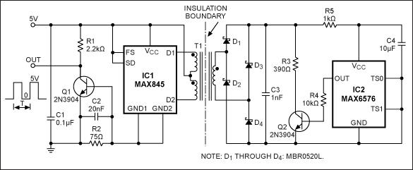 图1.该温度传感器(具有周期/频率输出的SOT温度传感器)由变压器隔离,供给数字输出,其周期编码温度(10μs/°K至640μs/°K)。