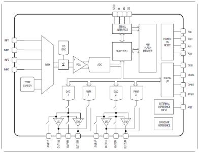 信号处理传感器集成了一个16位CPU,用户可编程的4kBFLASH程序存储器,128字节的FLASH用户信息,一个16位ADC,两个16位DAC,两个12位PWM数字输出,四个轨道-轨迹运算扩大器,一个SPI™兼容接口,两个GPIO和一个片上温度传感器。