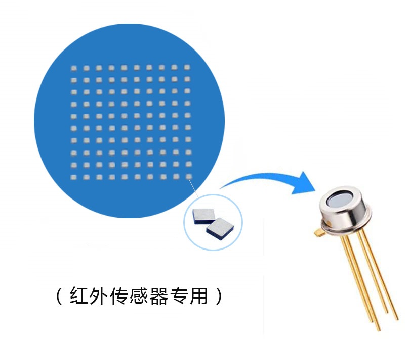 NTC热敏电阻晶片(蓝膜封装)在红外温度传感器Thermopile中是必不可少的元器件,NTC是对温度最灵敏(微小的温度变化引起电信号指数变化)的感温元件,在额温枪热电堆中测试基准环境温度,不同的环境温度温度热释电传感器有很大的影响,造成杂散和干扰信号,NTC热敏电阻就是做校准状态和测量状态下的温度数据,对热释电温度信号校准补偿最终得到准确的被测物温度。 NTC芯片会以邦定的封装工艺固定在红外热电堆中,起到温度监测的作用。