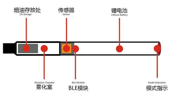 如图所示,电子烟是由烟油存放室,雾化室,传感器,BLE模块,锂电池,形式指示组成了烟杆+烟弹+烟嘴的根本结构,烟杆上就有开关,底部会有灯显现是否有电,烟油经过雾化器的加热发生蒸汽烟,而烟油自身是有味道,所以会有各种香气。市面上一般就有烟草、生果、花草、饮料这四种口味为主。
