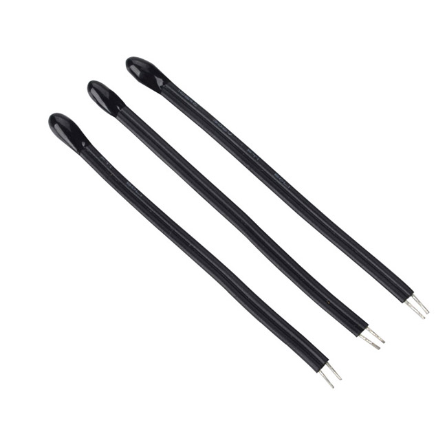 这款NTC热敏电阻也是市场上应用最广的一种NTC热敏电阻,用于温度的校准、补偿等等。它的头部选用环氧树脂涂装,导线是绝缘的,同样适用于空调和电池组等。