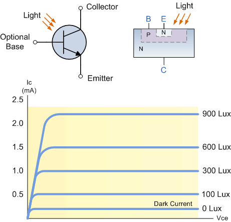 在NPN晶体管中,集电极相对于发射极正向偏置,使得基极/集电极结被反向偏置。因而,在结点上没有光正常泄露或暗电流十分小。当光落在基极上时,在该区域中形成更多的电子/空穴对,而且由该作用产生的电流被晶体管放大。