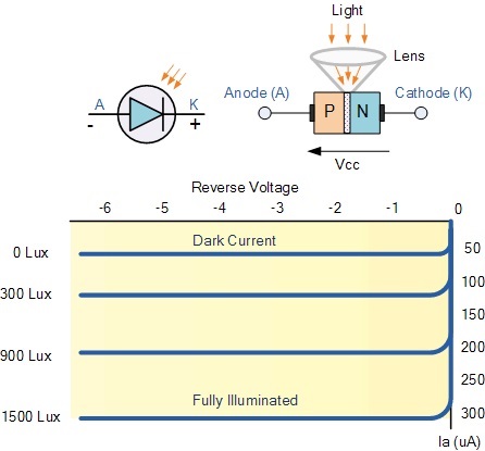 当用作光传感器时,光电二极管暗电流(0勒克斯)对于二极管约为10uA,对于硅型二极管约为1uA。当光落在结上时,构成更多的空穴/电子对而且漏电流添加。随着结的照射添加,该漏电流添加。