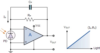 以下电路示出了使用运算扩大器作为扩大器材的光电流 -电压转换器电路。输出电压(Vout)为Vout=IP*Rf,而且与光电二极管的光强度特性成比例。