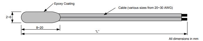 多种单绝缘,全封装传感器提供高达IP67的防水保护。传感器顶级涂有坚固的环氧树脂密封圈彻底掩盖NTC和引线衔接。