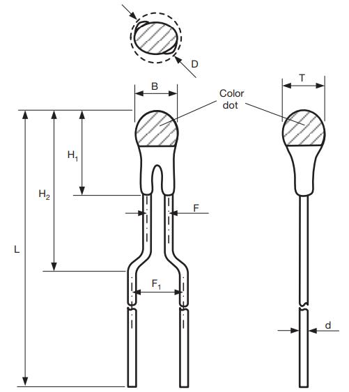 参数 数值 B最大值 2.5 T最大值 2.5 F 1.1 F1 2.54 D最大值 (安装直径) 2.5 d 0.4±10% H1最大值 5.5 H2最大值 10 L型 41±1