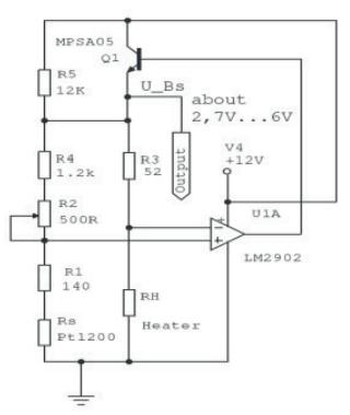 两个元件(加热器RH和传感器RS)可以在桥中切换。电阻器R1,R2和R3是在可选择的温差下正确地确认RS和RH之间的桥梁的尺寸(ΔT)。这是操控桥接电压的条件。当流速改动时,加热器的热丢失也会改动,这会影响所需的功能坚持RH和RS之间的温差。因而,桥上所需的电压,输入是流速的衡量标准。R1..R3的值取决于温差(ΔT)和具有的介质要衡量。它们是为客户供给的。