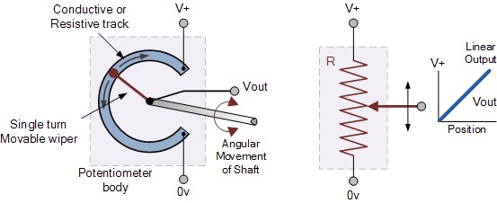 源自电位计的输出信号(Vout)在朝着电阻运动轨迹移动时从中心擦拭器衔接获取,而且与轴的角位置成比例。
