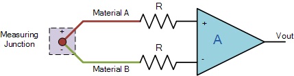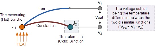 假如两个结处于相同温度,则两个结之间的电位差为零,换言之,没有电压输出为V1=V2。但是,当结在电路内衔接而且都处于不同温度时,将相关于两个结之间的温差V1-V2检测电压输出。这种电压差将跟着温度的增加而增加,直到到达结峰电压电平,这由所运用的两种不同金属的特性决定。